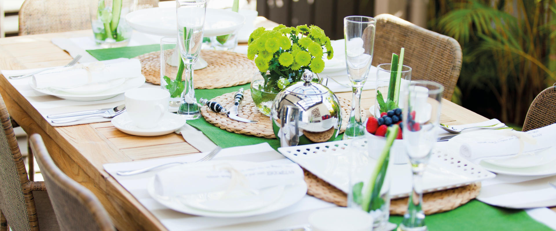 Und wenn Sie Ihre Gäste nicht nur kulinarisch verwöhnen wollen, finden Sie hier einige nützliche Tipps, wie Sie eine ungezwungene und dennoch exotische Atmosphäre schaffen können. Legen Sie Kissen um einen niedrigen Tisch, wie es in orientalischen Ländern üblich ist. Wählen Sie eine Tischdecke aus Stoff aus einer der Jahreszeit entsprechenden Themenpalette, vorzugsweise Pastellfarben im Frühling und kalte, aber kräftige Farben im Winter, gepaart mit einem Sortiment von Gläsern in passenden Ton-in-Ton-Nuancen sowie passenden Krügen und Tellern. Bei schönem Wetter können Sie auch im Freien decken, wobei darauf zu achten ist, dass für die Sitzgelegenheiten am Boden wasserfeste Stoffe verwendet werden. Im Handumdrehen ist der Tisch elegant, aber ohne zu viel Schnickschnack gedeckt. Wenn Sie sich für frische Blumen auf dem Tisch entschieden haben, denken Sie daran, dass es eine nette Geste wäre, sie vor der Verabschiedung unter den Gästen aufzuteilen.