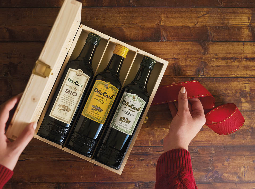 Die Olio Carli Geschenkbox ist ein Geschenk voller Sorgfalt, Geschmack und Alltagskultur. Ideal zum Teilen in der Festzeit – oder als Vorrat für besondere Rezepte. Sie schenkt dir jeden Tag die Freiheit, das passende Olivenöl zu wählen: zart für einfache Gerichte, intensiv zum Verfeinern kräftiger Aromen.