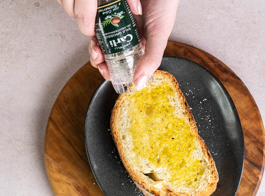 Sorgfältig ausgewählte Zutaten verfeinern jedes Gericht: harmonisches Olivenöl Extra Vergine, frisches Basilikumöl, intensiver Balsamico di Modena IGP und mediterranes Meersalz mit Oliven und Rosmarin.